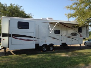 The next light bulb turned on after we obtained possession. There is the ominous towing and set-up that follows. Tim only ran over one curb on the U-turn under I-45, so Cindy was proud of his newly acquired skills. The RV dealership had walked through all the details of the Fifth Wheel including every aspect of set-up; we were expected somehow, quite miraculously, to remember what plugs in where, when to hook and unhook, when and how to “dump” gray versus black tanks, how and where to tie everything down, close and lock the hatches, etc. Needless to say, we forgot a few things; fortunately we took copious notes.
